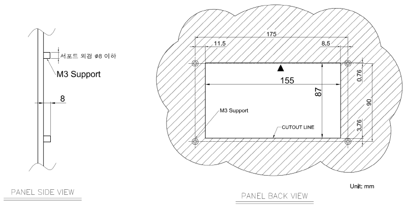 1. 판넬 컷 도면 치수대로 사용자의 판넬을 따냅니다. 또한 제품의 고정 홀 위치에 맞게, 판넬 뒤쪽에 스탠도프와 같은 지지대가 준비되어 있어야 합니다. (사출케이스 적용 역시 아래 도면을 참고하여 설계하시면 됩니다. 보스 사항: M3탭 추천, 외경은 Ø8 이하)