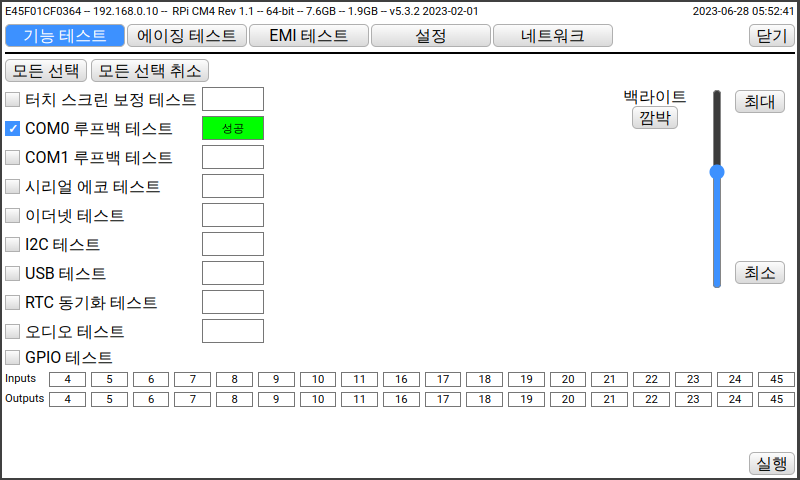 COM1 Loopback TEST는 COM1이 RS232C인 경우에만 사용할 수 있는 테스트이므로, RS485로 되어 있는 컴파일파이에서는 이 방법대신, 바로 밑에 있는 Serial Echo Test 를 사용합니다.