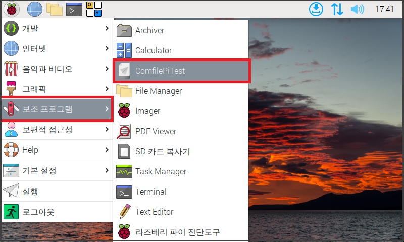 컴파일파이에는 기능점검을 위한 프로그램이 들어 있습니다. 보조 프로그램>ComfilePiTest 실행