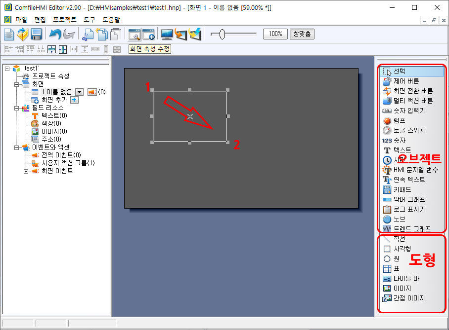 키워드: Comfile Studio 위젯, 도형 차이, 위젯이란, 화면 그리기, HMI 위젯 생성, 외부장치 주소 연동