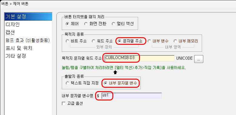 버튼을 누르면 내부 문자열 변수 $str1의 내용이 지정한 PLC 주소에 기록됩니다.