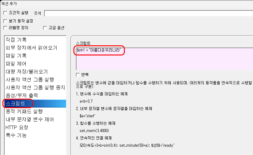 <내부 문자열 변수 제어> 액션을 통해