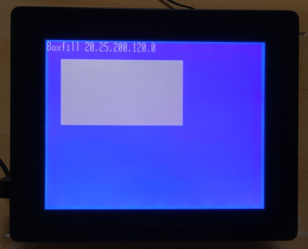 #include "CT18XX" Ct18contrast 150 Glocate 0,0 Gprint "Boxfill 20,45,200,120,0" Glocate 0,16 Gprint "Boxfill 120,85,300,220,2" Boxfill 20,45,200,120,0 Boxfill 120,85,300,220,2 ' XOR 연산, 겹친부분은 반전됨