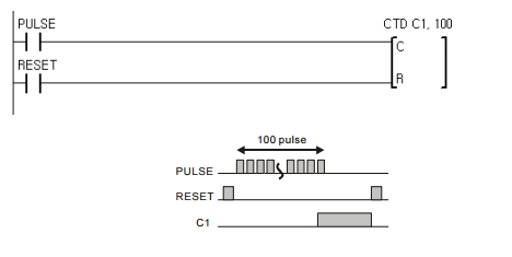 업 카운터 명령입니다. 입력이 들어오면 카운터 값을 1 증가 시킵니다. 카운터 값이 설정치와 일치하면 카운터 접점을 ON 합니다. 리셋 입력이 들어오면 카운터 값은 0 이 됩니다. 최대 65535 까지만 사용가능합니다. 설정치에 도달하고, 접점이 ON 된 이후에는 입력시그널이 들어와도 무시합니다.