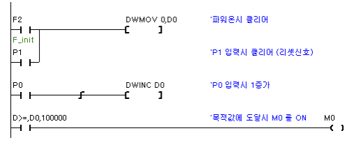 P0 가 입력되면 D0,D1 에 있는 더블워드값이 증가됩니다. 이 값이 100000 에 도달하면 M0 가 ON 됩니다. 리셋 시 또는 P1 이 입력되면 D0,D1 이 클리어됩니다.