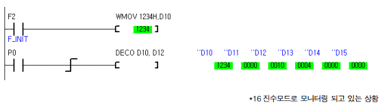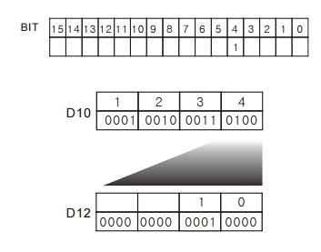 P0 접점이 ON 되면 D10 에 저장되어 있는 값의 하위4 비트를 대상으로 합니다. 위의 레더에서는 1234H 이므로 4 가 됩니다. 그러면 16 비트중 비트4 를 1 로 만든 값을 D12 에 저장합니다. “비트 4 번을 1 로 만들어라”로 이해 하시면 됩니다.