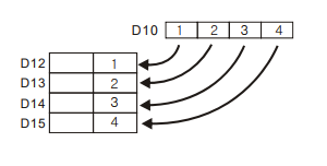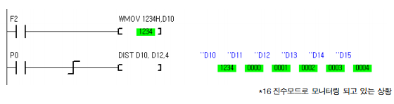 N 은 최대 4 까지만 사용할 수 있습니다. (1 부터 4) 위의 래더가 실행되면 D10 에 있는 1234H 가 4 비트 단위로 쪼개져서, D12 에 1 이 들어가고, D13 에 2 가 들어 가고, …D15 에 4 가 들어갑니다.