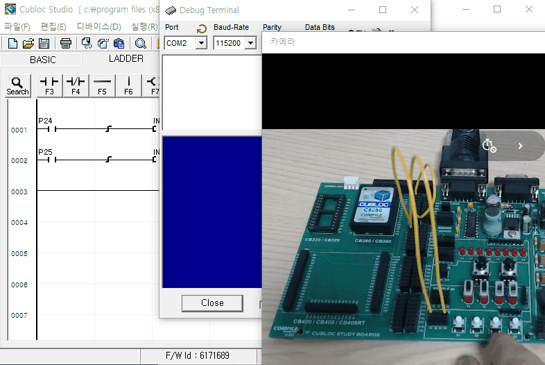 Const Device = CB280 Dim i As Integer Usepin 24,In Usepin 25,In Low 30 Set Ladder On On Ladderint Gosub msg1_rtn Do Loop msg1_rtn: ' 레더에서 인터럽트가 발생하면 Debug 창에 표시 If _D(0) = 3 Then Debug "ON Ladderint #3 ",Cr Endif If _D(0) = 4 Then Debug "ON Ladderint #4 ",Cr Endif _F(40) = 0 Return