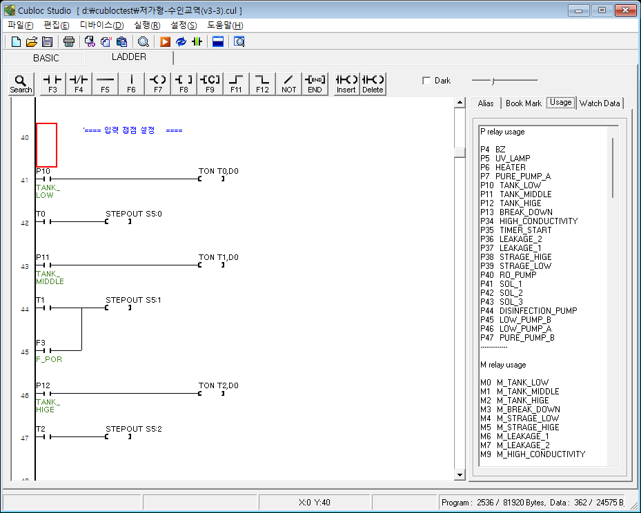 사용된 릴레이 또는 레지스터를 모아서 보여주는 기능입니다. 우측 화면에서 Usage를 클릭하세요.