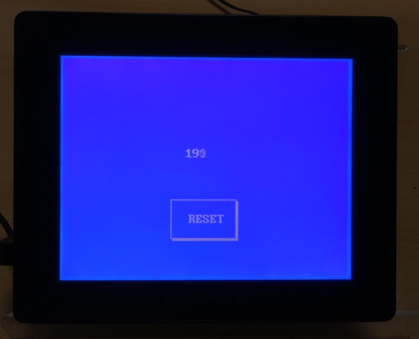 #include "CT18XX" Dim I As Integer Dim TX1 As Integer, TY1 As Integer Contrast 550 On Pad Gosub GETTOUCH Menuset 0,2,120,155,195,200 Menutitle 0,20,14,"RESET" '<---- 이곳 Do Locate 15,6 Print DEC5 I Incr I Delay 200 Loop GETTOUCH: TX1 = Sys(10) TY1 = Sys(11) If Menucheck(0,TX1,TY1) = 1 Then Menureverse 0 Ct18beep 20 '키터치음 발생 I = 0 End If Return