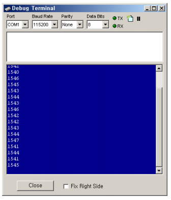 MCP320 의 CH0, CH1 핀에 인가되는 전압은, MCP3202 에 인가되는 전원전압을 초과해서는 안됩니다. A/D 변환 결과는 DEBUG 창에 표시됩니다.