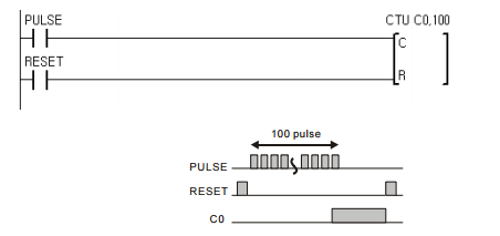 입력이 들어오면 카운터 값을 1 증가 시킵니다. 카운터 값이 설정치와 일치하면 카운터 접점을 ON 합니다. 리셋 입력이 들어오면 카운터 값은 0 이 됩니다. 최대 65535 까지만 사용가능합니다. 설정치에 도달하고, 접점이 ON 된 이후에는 입력시그널이 들어와도 무시합니다.
