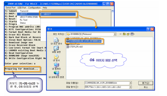 CUWIN5000/6000시리즈는 OS Update및 OS 응급복구를 위하여 OS 이미지 다운로드 모드를 지원합니다. 아래와 같은 순서로 OS를 Update하실 수 있습니다.
