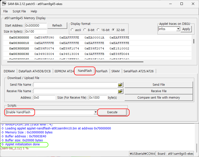 - “NandFlash” 탭을 선택합니다.”스크립트” 제목 아래 드롭다운 목록에서 “NandFlash 활성화”를 선택하고 “실행” 버튼을 누릅니다.
