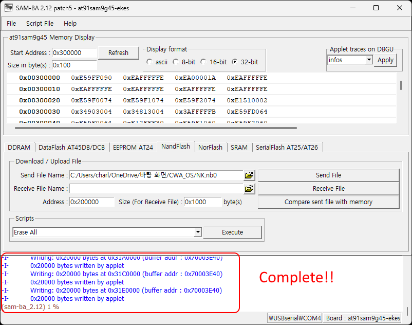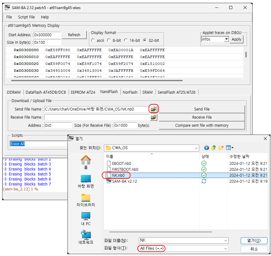 - “파일 보내기” 버튼을 누르세요. SAM-BA 유틸리티는 데이터를 CUWIN CWA의 NAND 플래시 메모리에 업로드합니다. 완료될 때까지 기다리십시오. 몇 초 밖에 걸리지 않습니다. (이 작업은 Script선택과 관계가 없습니다.)