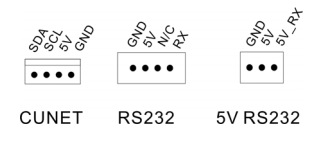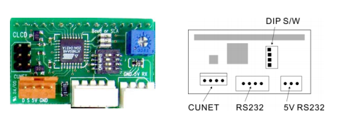 CLCD는 CUNET(I2C)통신 이외에도 RS232신호를 받을 수 있도록 되어 있습니다. RS232에는 2종류의 콘넥터가 있는데, 3핀 콘넥터 5V레벨의 RS232신호를 연결하는 콘넥터입니다. PC와 직접 연결하고자 할 때에는 +/- 12V 레벨의 RS232신호를 연결하는 4핀 콘넥터를 사용합니다.