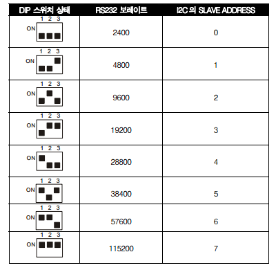 딥스위치로 보레이트 및 I2C 슬레이브 어드레스를 설정할 수 있습니다. DIP스위치 중 4번 스위치는 사용하지 않는 스위치입니다.