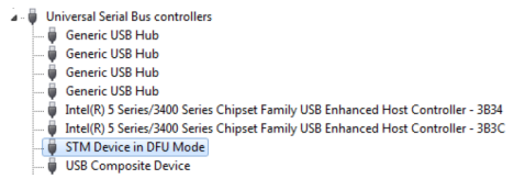- USB드라이버가 성공적으로 설치되면, PC의 <시스템등록정보> <장치관리자>에서 다음과 같은 상황을 볼 수 있습니다. (STM Device in DFU mode 가 새롭게 설치됩니다.)