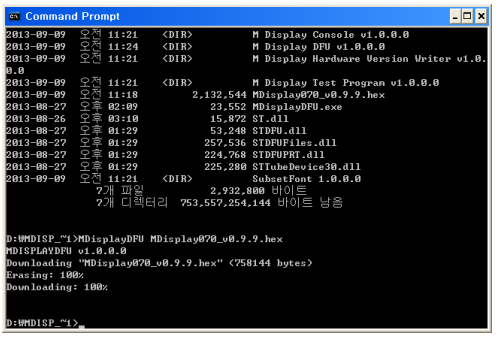 DFU는 command prompt실행창에서 실행시키십시오. M display로 다운로드할 최신 펌웨어 (hex파일)은 www.comfile.co.kr에서 다운로드 받으실 수 있습니다. 명령어는 다음과 같습니다. 해당 실행파일이 있는 폴더로 이동하셔서 실행하셔야 합니다.