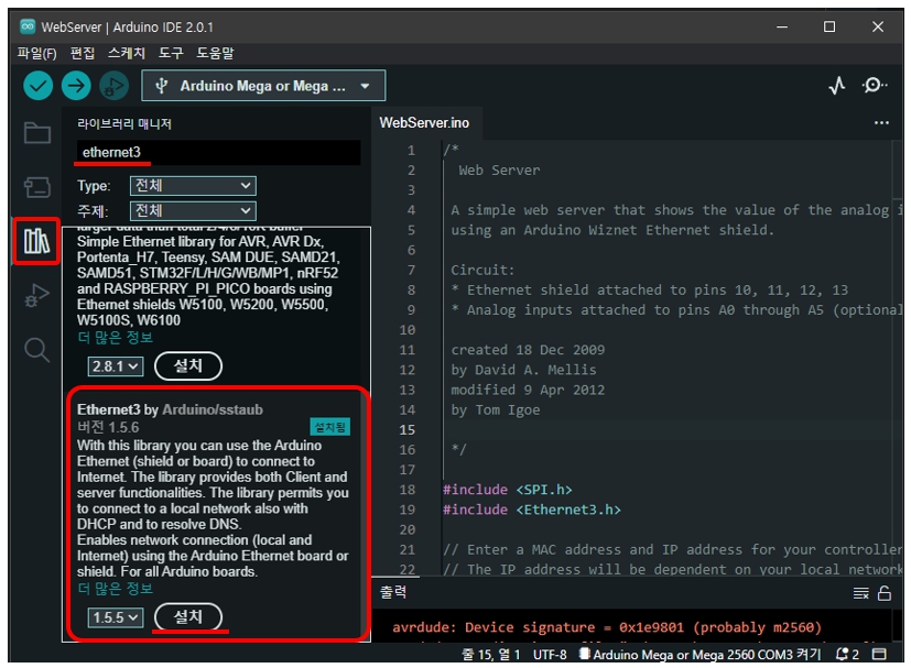 - 라이브러리 등록 : 라이브러리 매니저 » “ethernet3”검색 » Ethernet3 설지