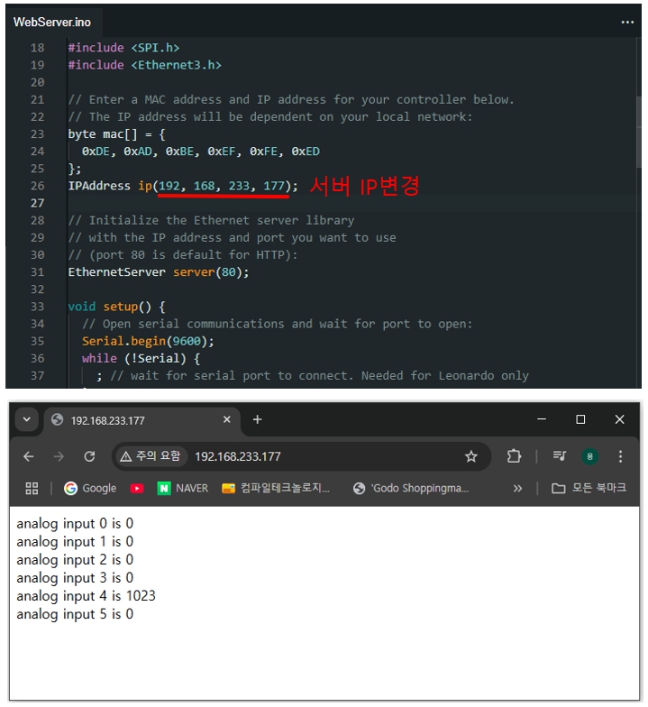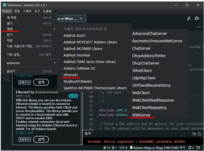 - Webserver 예제 프로그램 : 파일 » 예제 »Ethernet3 » Webserver