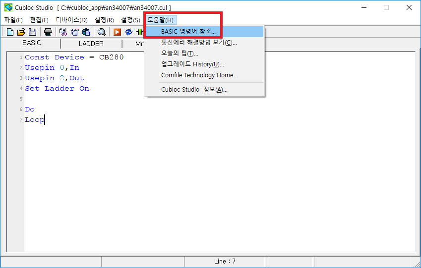 또는 CUBLOC STUDIO 상단 메뉴의 <BASIC 명령어 참조>를 클릭하셔도 동일한 내용을 확인할 수 있습니다.