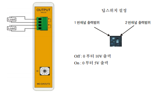 2 채널, 0~5V 또는 0~10V 출력이 가능한 D/A 컨버터 모듈입니다. 하단 딥스위치를 조정하여 출력범위를 결정합니다.