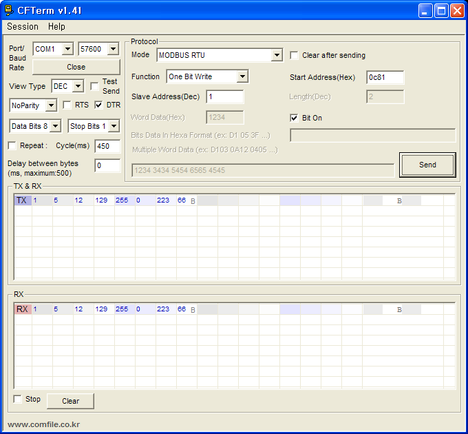 릴레이모듈 MD-DORL8 의 0번 1번 릴레이를 ON 시킨 상태입니다. 이렇게 하기위해서 CF-TERM에서는 다음과 같이 하였습니다.