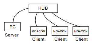 하나의 허브에 여러 개의 모아콘과 PC 를 연결하여 서로 통신하는 경우입니다. 이때 반드시 허브는 (인터넷 연결기능이 없는) 스위칭허브를 사용해야 합니다. 인터넷공유기는 사용하실수 없습니다.
