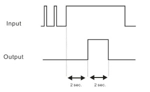 아래 그림처럼 최초 2초간 신호가 유지되어야 비로소 출력을 On 하는 상황입니다. 출력도 2초간 On하고 꺼져야 합니다. (실제로는 2초까지 대기할 필요는 없습니다. 0.5초~1초미만이면 노이즈제거에 충분합니다.)