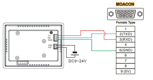UIF-5K 는 LCD 디스플레이와 5 개의 버튼을 갖춘 유저인터페이스용 패널입니다. UIF-5K 는 RS232C 로 통신하도록 되어 있습니다. 모아콘의 RS232C 채널 0 을 통해서 UIF-5K 와 연결하실 수 있습니다.