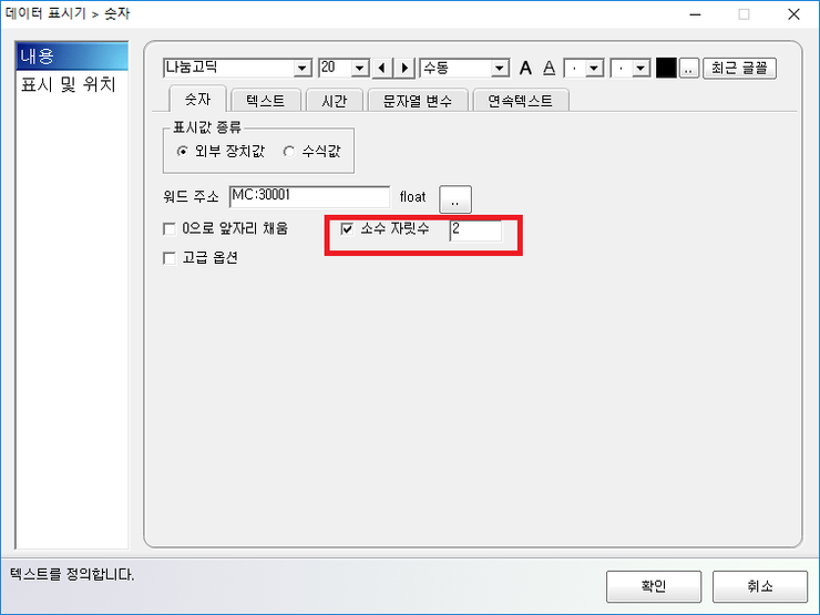 숫자 위젯을 화면에 올린뒤, 위젯을 더블클릭하시면, 아래와 같은 박스가 나옵니다.