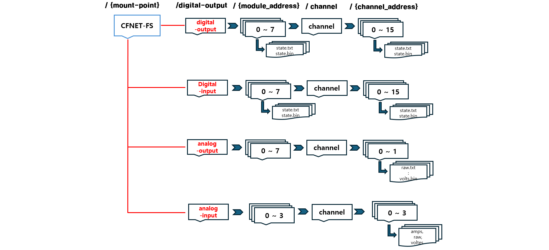 Modular Pi는 연결된 I/O 모듈을 가상 파일 시스템(CFNET-FS) 형태로 제공합니다.