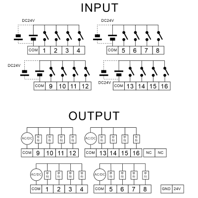 - 입력 16점 (양방향 DC 24V 옵토 커플러 입력)