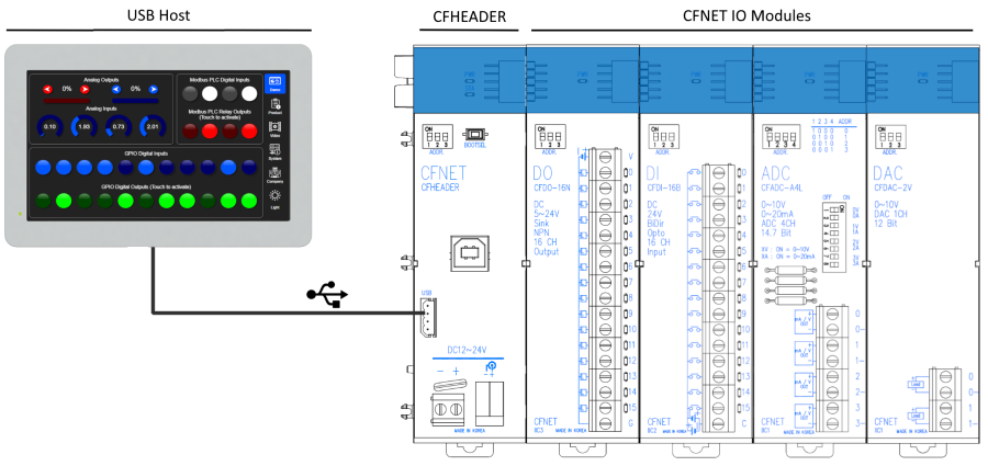 The CFHEADER is a USB interface module that provides a USB device interface to the CFNET IO modules. It can be used to add programmable digital and analog IO to any USB Windows or Linux host PC including our Windows Panel PC and Linux industrial panel PCs.