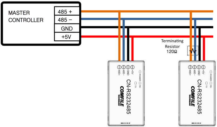 Connect a 120Ω terminating resistor between the +485 and -485 terminals. This product automatically controls DTR.