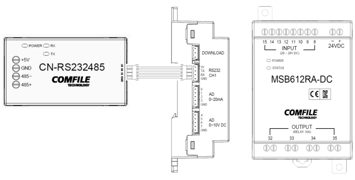 The following illustration shows how to connect the CN-RS232485 to an CUBLOC MSB's RS-232 serial port to allow it access to an RS-485 network.