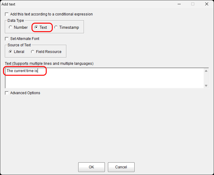 The Text Builder can concatenate several text strings together and display them as a single line of text. This feature provides the ability for dynamic text to appear in the middle of a text string.