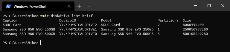 wmic diskdrive list briefin a command shell