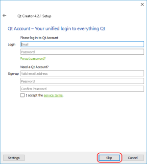 It is not necessary to create a Qt account to install Qt Creator. If you don't have or want a Qt account, just press the Skip button.