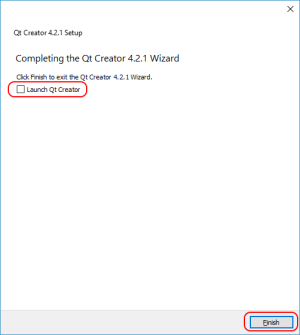 After installation is finished, uncheck the Launch Qt Creator and press the Finish button to finish the installation; Qt Creator can be launched after installing the ComfilePi SDK.