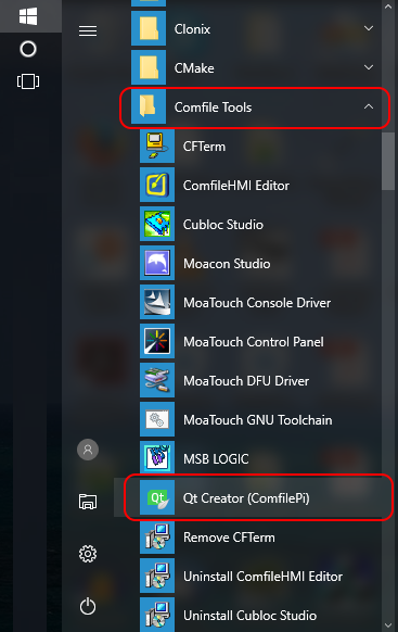 From the Windows Start Menu, browse to the Comfile Tools folder and select the Qt Creator (ComfilePi) item. This shortcut points Qt Creator to a settings folder containing a Qt Kit already prepared by COMFILE Technology for the ComfilePi.