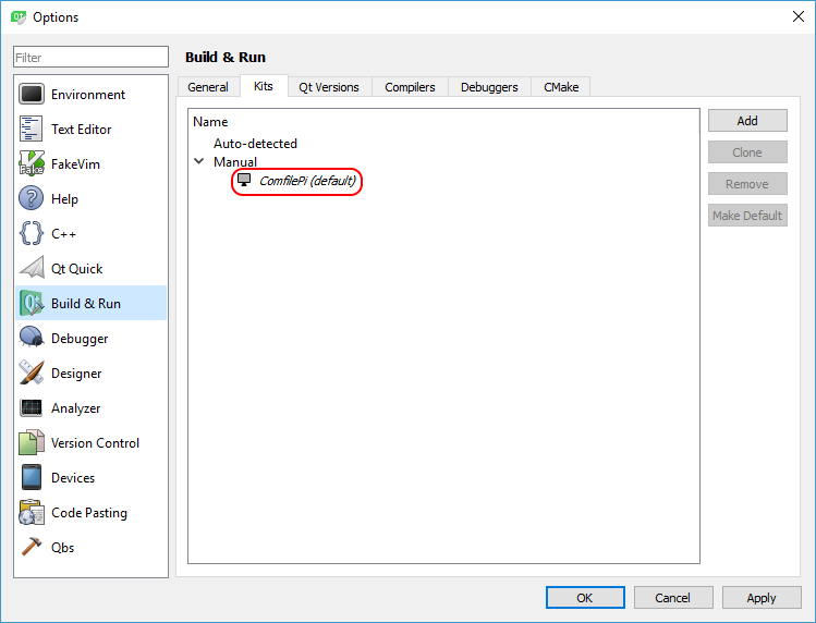 Go to Tools–>Options, and in the Options window that appears, go to Build & Run–>Kits. There the ComfilePi kit should appear as shown below: