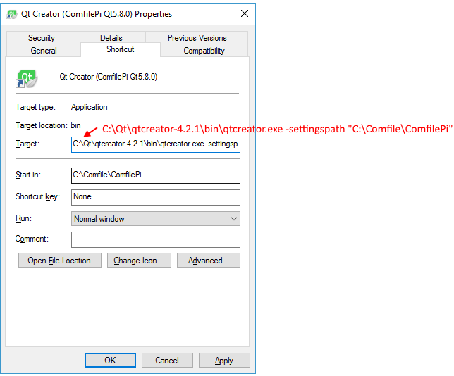 C:\Qt\qtcreator-4.2.1\bin\qtcreator.exe -settingspath C:\Comfile\ComfilePi\