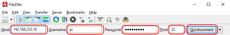 Once installed run the FileZilla Client and connect to the ComfilePi by entering its IP address, username (default: pi), password (default: raspberry) and port (22 for SFTP), and pressing the Quickconnect button.