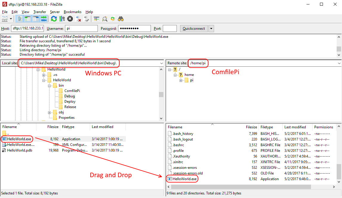 Drag and drop the files from the Windows PC to the ComfilePi.