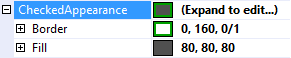 The CheckedAppearance property describes the appearance of the checkbox when it is in the checked state (i.e. Checked = true), and the UncheckedAppearance property describes the appearance of the checkbox when it is in the unchecked state (i.e. Checked = false). Please see Fills, Strokes, and Borders for more information on how to adjust these properties.