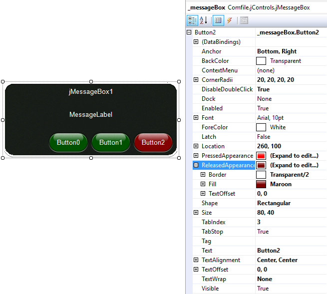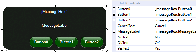 jMessageBox also exposes 4 properties for setting the buttons' text: CancelText, NoText, OKText, and YesText. These provide the ability to customize the text that appears for the buttons according to the jMessageBox.Buttons enumeration passed to the Open Method. This can be particularly useful when creating a multilingual UI.