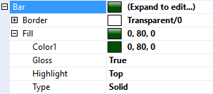 The Bar property is used to customize the appearance of the part of the control that indicates progress. It uses the same features described in Fills, Strokes, and Borders and Highlights and Gloss.