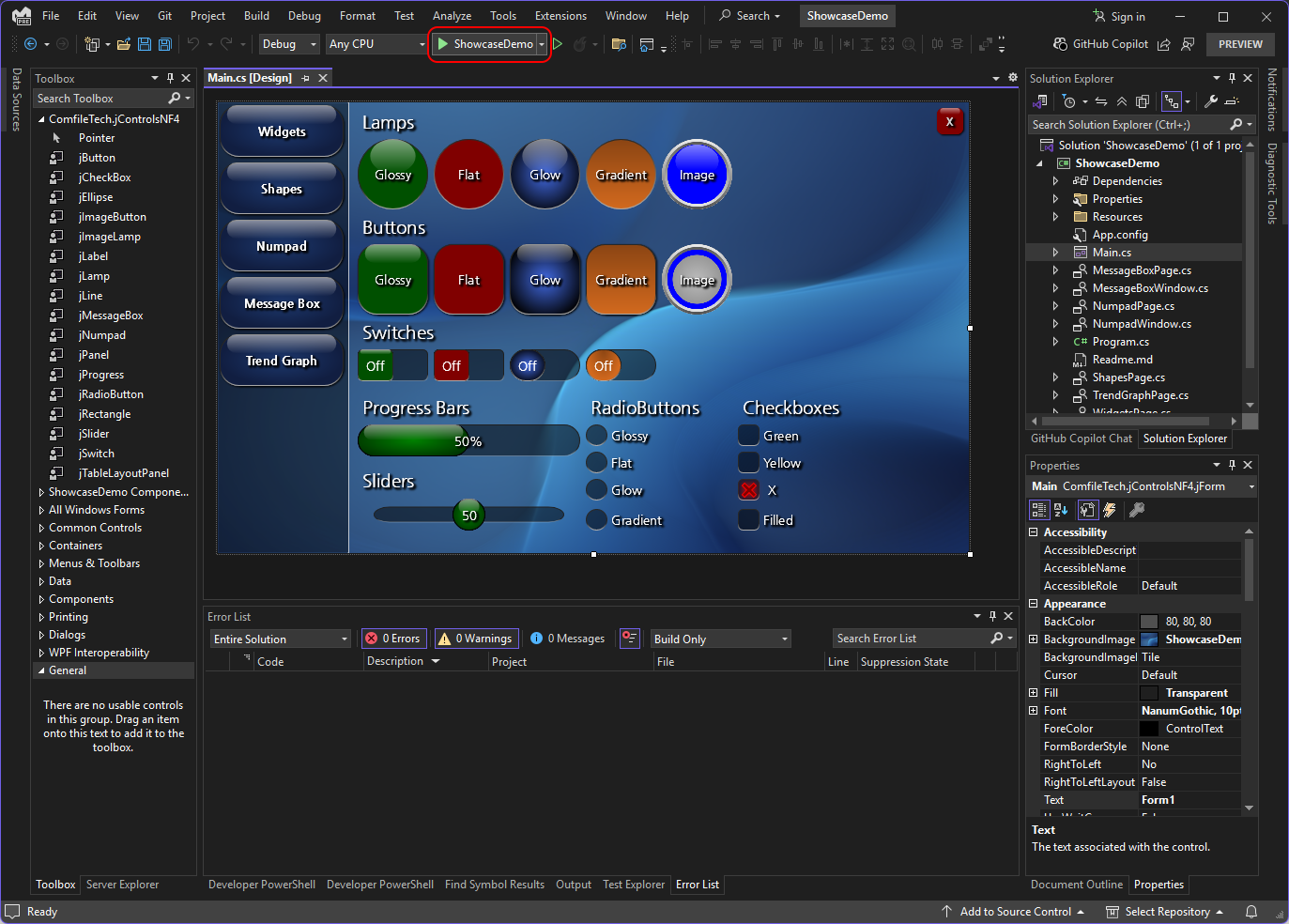 After installing the project templates from COMFILE Technology's Nuget feed, as described in Setting up a Development Environment, you will find several project templates to help you get started. One is the jControls NF4 Showcase project template. It serves as a demonstration of the many controls in the jControls NF4 library, while also providing a convenient way to try out the library and become familiar with its features.